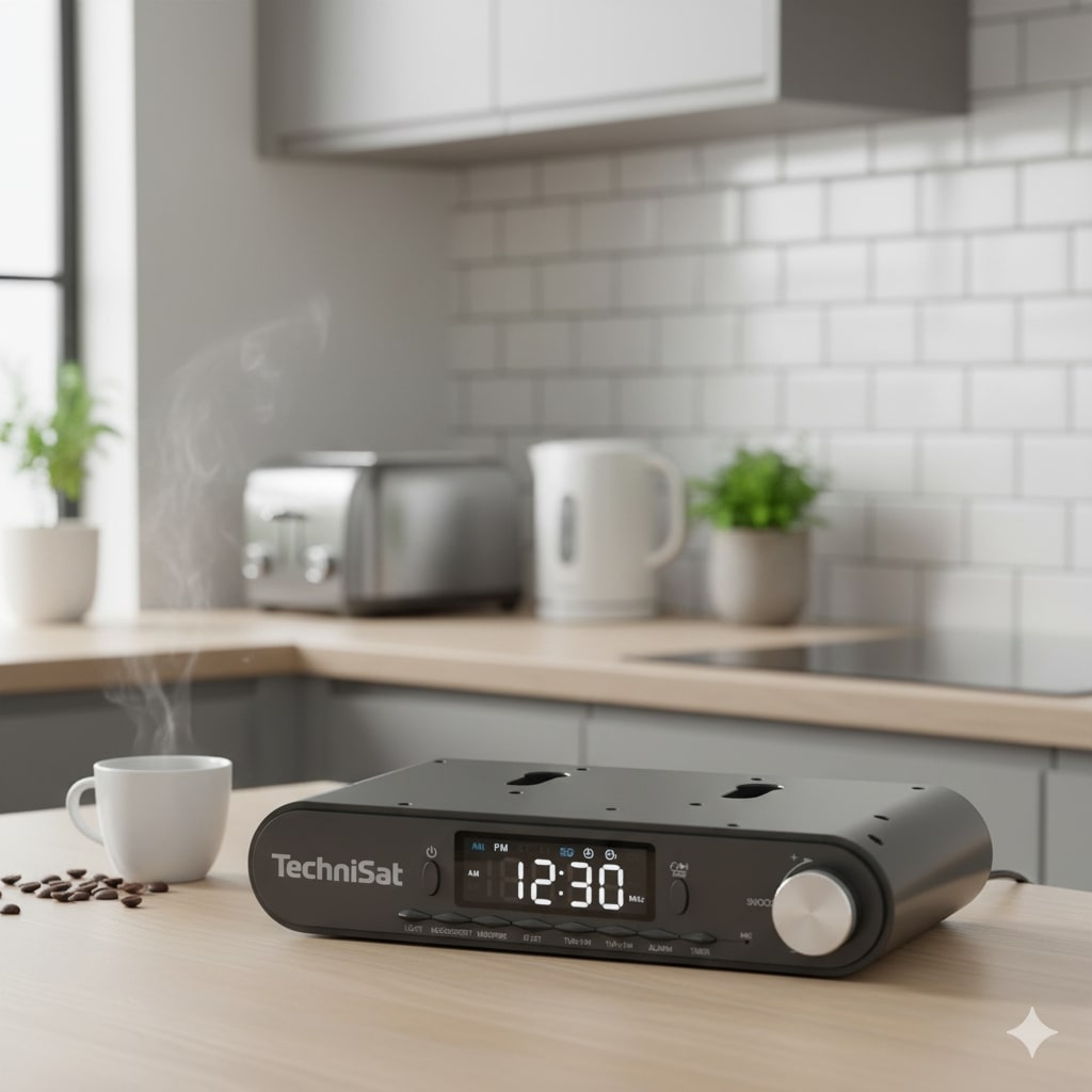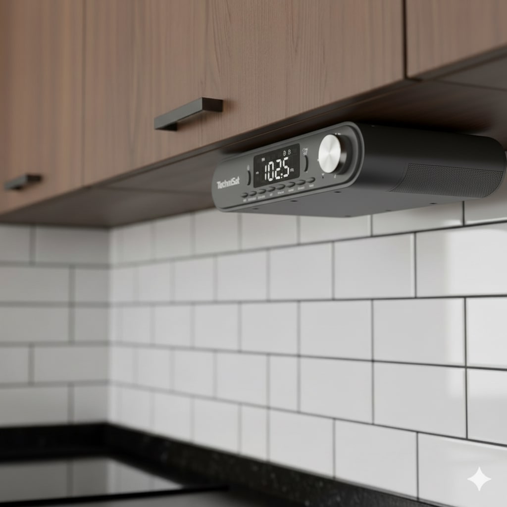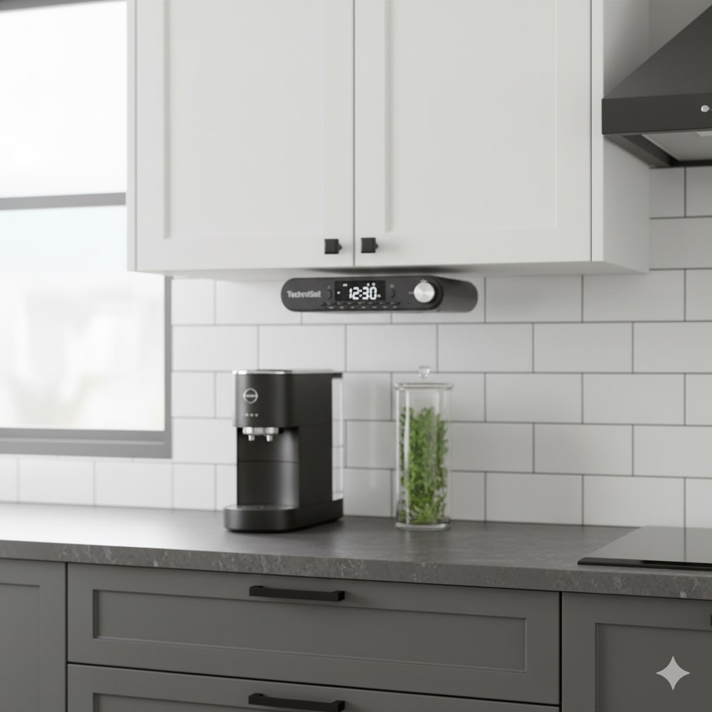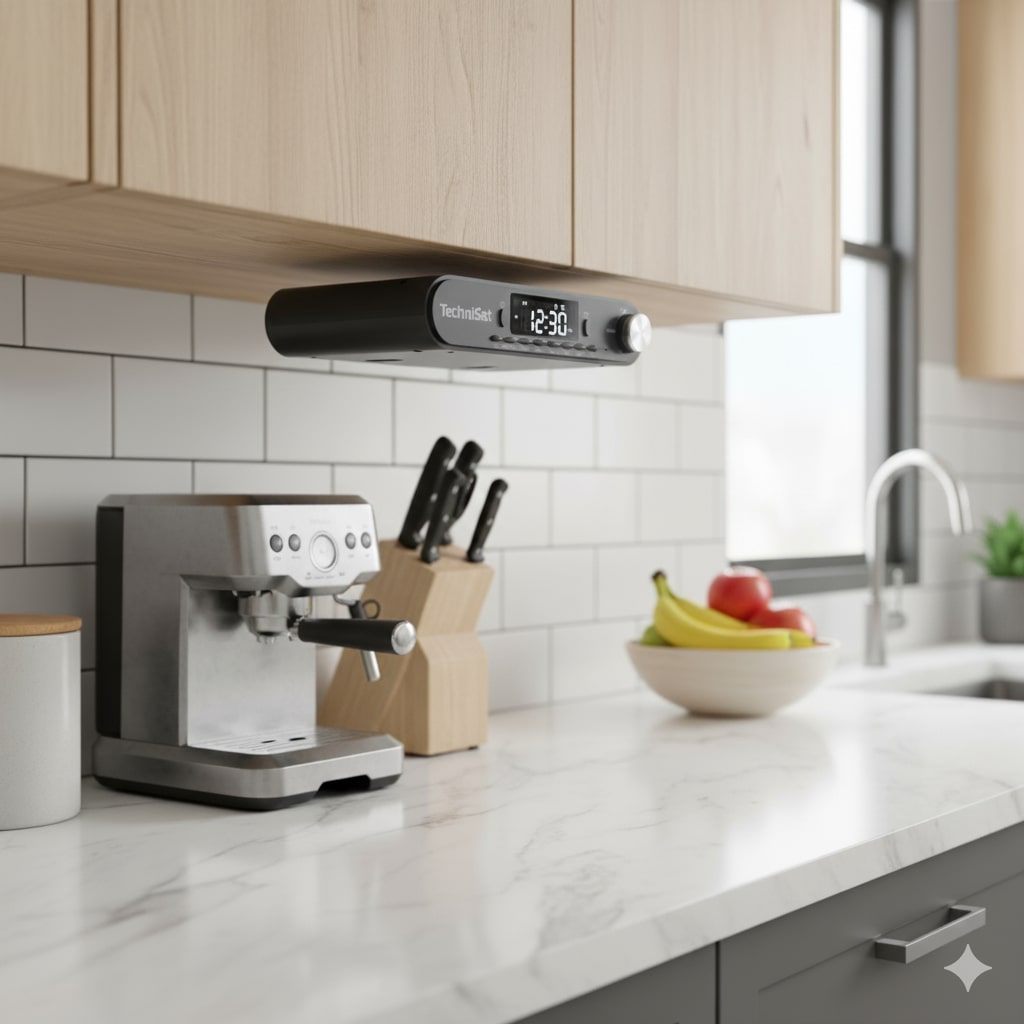 Poranna kawa lepiej smakuje, gdy dźwięk nie walczy o miejsce z nożem do chleba. Ten model zaprojektowano tak, by zniknął pod szafką, zostawiając blat w idealnym porządku – a jednocześnie wypełniał kuchnię muzyką, wiadomościami i podcastami bez kablowego chaosu. Antracytowa obudowa wpisuje się w nowoczesne fronty i ciemne blaty, a dyskretne podświetlenie LED pod szafką pełni rolę nocnego światła, które nie mruży oczu o świcie.